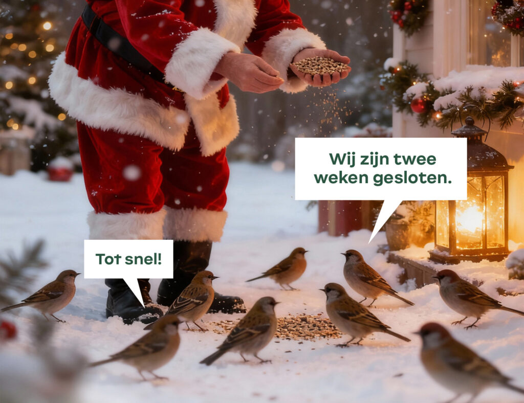 We zijn gesloten van zaterdag 20 december 2025 t/m zondag 4 januari 2026. Vanaf maandag 5 januari zijn wij er weer met de volledige bezetting.